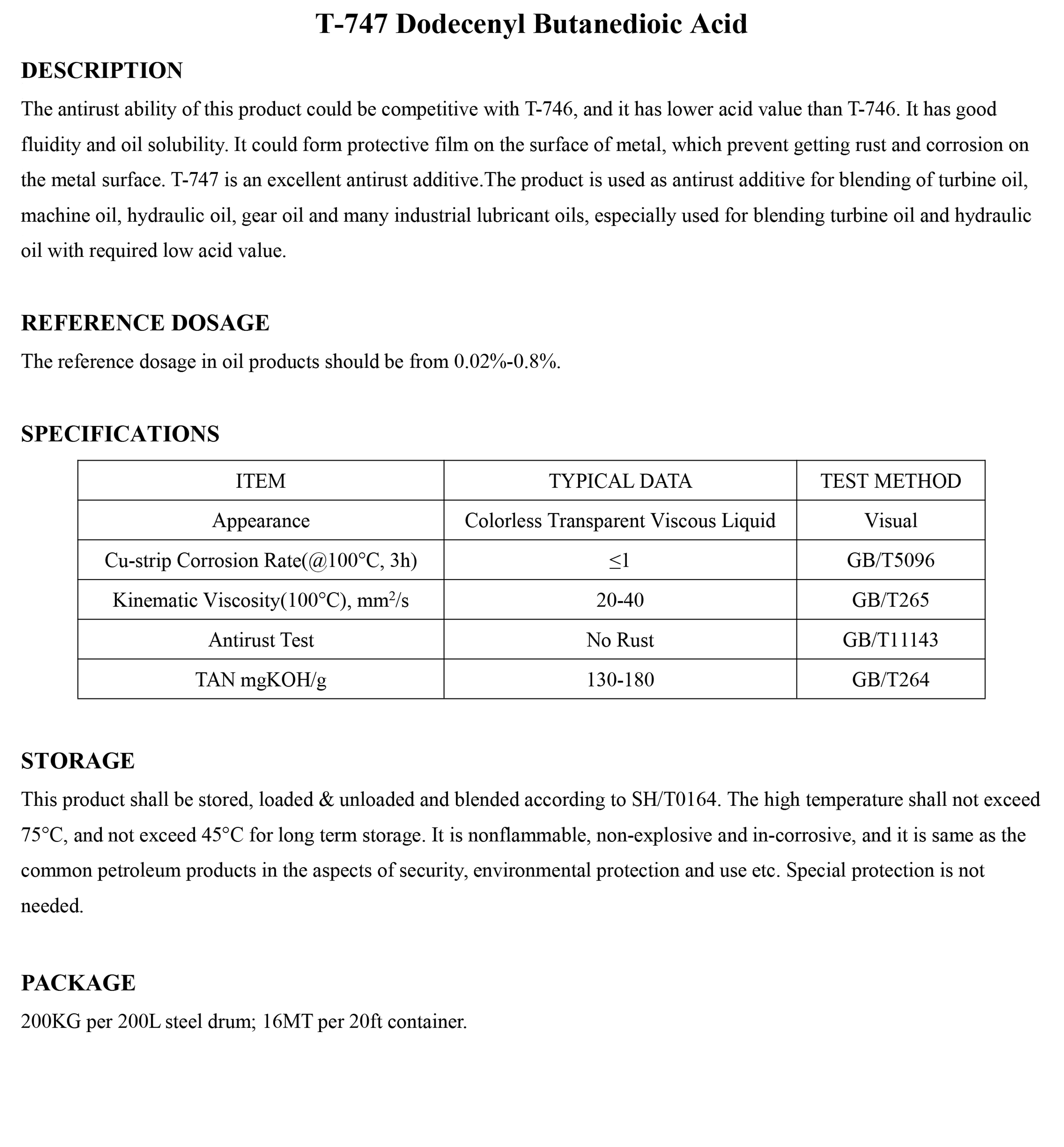 T-747 Dodecenyl Butanedioic Acid-Antirust Additive-錦州新興石油添加劑有限責(zé)任公司